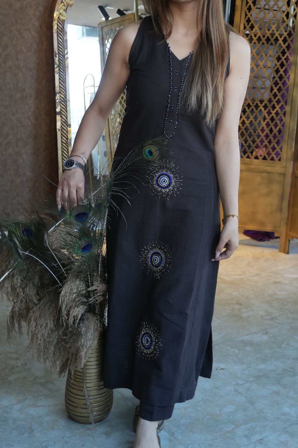 This stylish black kurta is a perfect blend of minimal design and artistic detailing. Crafted from soft and breathable fabric, it features delicate peacock-inspired motifs along with intricate embellishments that add a unique charm to the outfit.